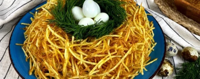 Izvirna solata “Gnezdo jerebice” ali “Prepeličje gnezdo” je idealna varianta, kaj pripraviti za praznik. Recept je preprost in dostopen vsakomur. In rezultat je tako okusen, da nihče ne bo zavrnil dodatka.
